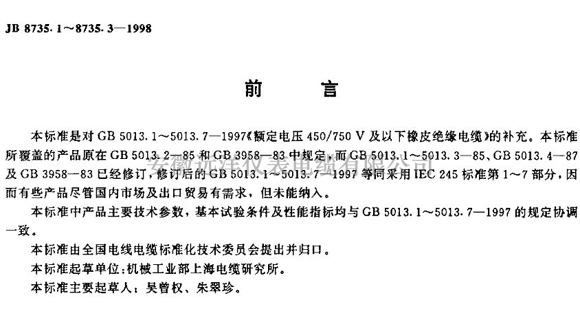 JB 8735.1-1998 額定電壓450V/750V及以下橡皮絕緣軟線和軟電纜 首先部分:一般規定
